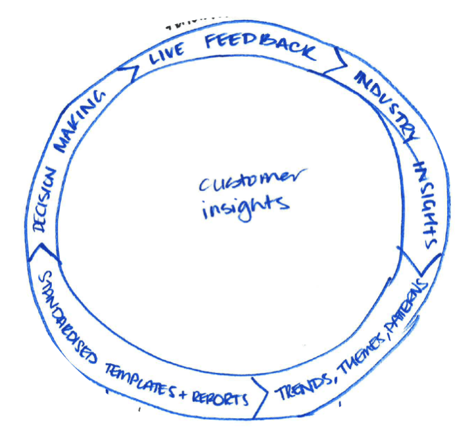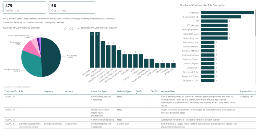 A big spreadsheet, a standardised tagging system, a power BI dashboard, a set of re-usable & shareable tools and templates. All came about through a range of workshops, a series of testing, feedback, ctrl+z’s and iteration. Collaboration across 7 groups including design, research, product, sales, managed service, strategy and marketing teams. The result, over 50 research documents accessible from one location with thousands of customer, employee and partner comments tagged, filtered and searchable by segment, industry, product, domain, journey stage, verbatim type & more!